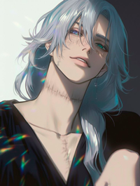 Особенности: Аль полон особенностей. Во-первых, это гетерохромные глаза, правый жёлтого цвета, левый – синего. Волосы светло-голубоватого цвета, длинные, чуть ниже лопаток, и мягкие, чаще всего разделены на две или больше прядей, концы которых связаны резинками. Весьма красивое слегка накачанное тело… когда-то было. Теперь сплошь покрыто шрамами, которые обозначают места, где тело разрубали на части топором. На шее такой же шрам, потому что голова не избежала отделения. На лице, некогда весьма привлекательном, тоже два шрама, но лицо не подвергалось разрубанию, а лишь получило глубокие порезы посеребренным клинком.Лицо ещё без шрамов